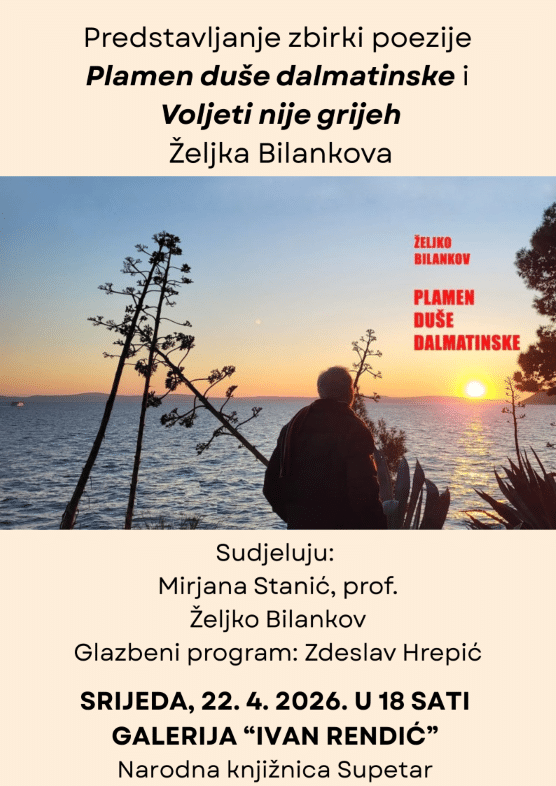 U srijedu, 22. travnja u 18 sati, u Galeriji “Ivan Rendić” održat će se predstavljanje zbirki poezije Plamen duše dalmatinske i Voljeti nije grijeh autora Željka Bilankova.