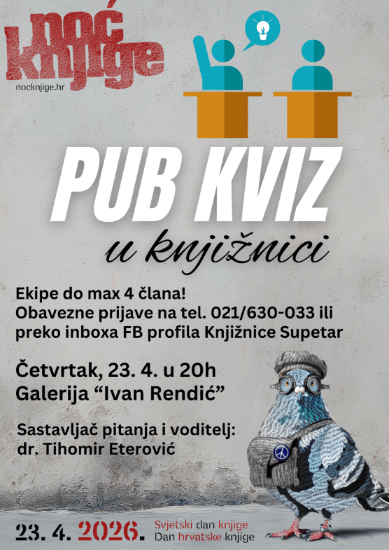 Povodom ovogodišnje Noći knjige, knjižnica organizira pub kviz koji će se održati u četvrtak, 23. travnja, s početkom u 20 sati. Pozivamo sve ljubitelje knjige, znanja i dobre zabave da nam se pridruže i okušaju u ovom zanimljivom i dinamičnom natjecanju.